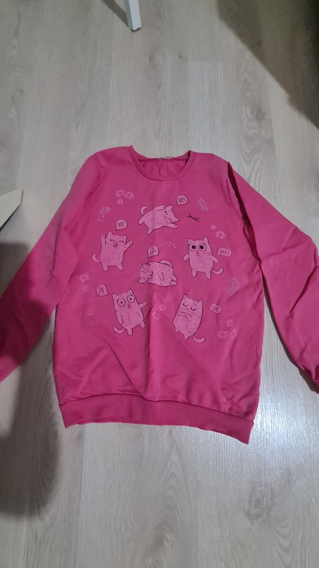 Uzun kollu, yuvarlak yakalı pembe sweatshirt, örme dokulu ve baskılı sevimli kedilerle süslenmiş. Yumuşak ve rahat kumaştan üretilmiştir.