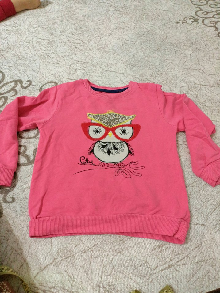 Pembe renkli kız çocuk sweatshirt, uzun kollu ve yuvarlak yakalıdır. Önünde renkli baykuş baskısı vardır ve yumuşak, sıcak örme kumaştan üretilmiştir. Dört beş yaş uyumlu dur.