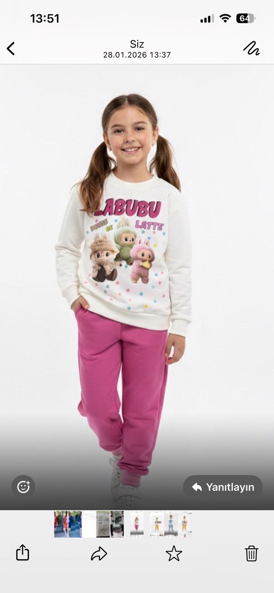 Kız çocuklar için uzun kollu, baskılı ve yuvarlak yakalı sweatshirt ile pembe renkli, örme eşofman altı içeren rahat ve yumuşak kumaştan takım. 8 yaşa kadar mevcut