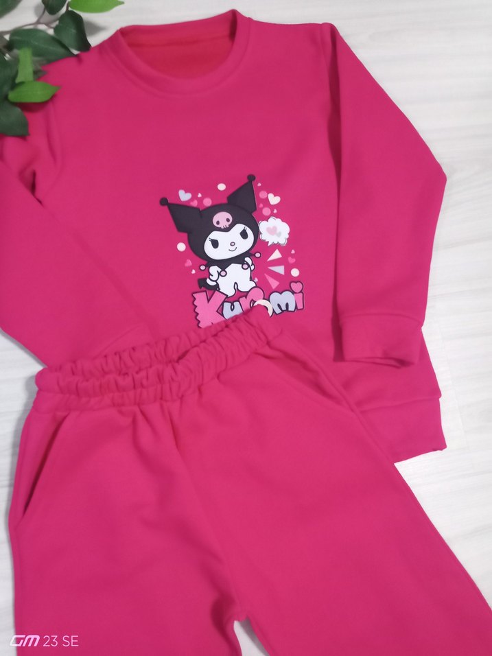 Pembe renkli, uzun kollu sweatshirt ve eşofman takımı, renkli baskılı, örme dokulu ve bol kesimdir. Yumuşak ve sıcak kumaştan, bisiklet yaka ile rahat sokak stili için uygun.