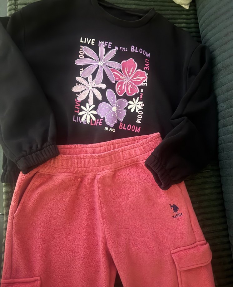 Siyah, uzun kollu, baskılı çiçek desenli sweatshirt ve pembe, bol kesim, yumuşak dokulu eşofman altı takımı. Sweatshirtte 'BLOOM' yazısı yer alır. Kalın kışlık üç iplik şardonlu kumaş yepyeni