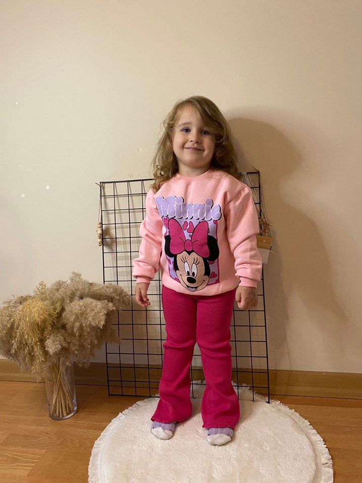 Pamuklu polar kumaştan, bol kesim pembe sweatshirt ve örme pantolon takımı. Minnie Mouse baskılı, uzun kollu ve bisiklet yakalı rahat tasarım. 3-8 yaş arası bedenler ŞARDONLU TAKIM