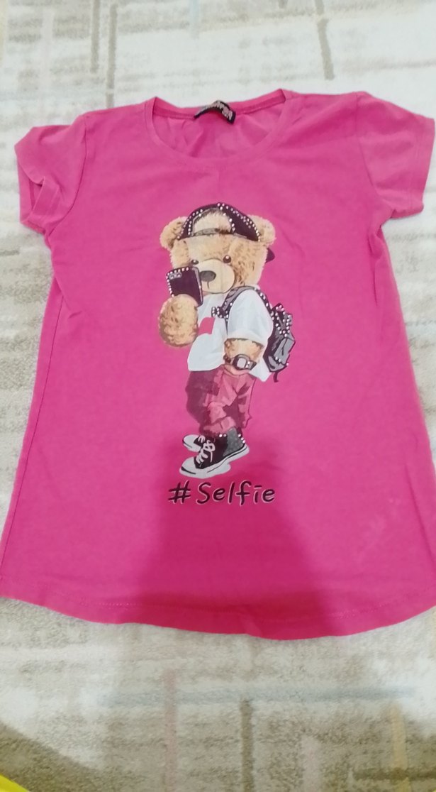 Pembe renkli kız çocuk tişörtü, selfie temalı renkli baskı ve yuvarlak yaka ile. Kısa kollu ve bol kesim rahat kullanım sağlar. #Selfie