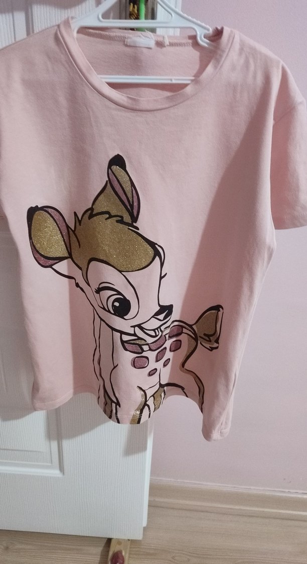 Yumuşak pamuklu kumaştan, yuvarlak yakalı, kısa kollu ve bol kesim pembe tişört, baskılı tasarıma sahiptir.