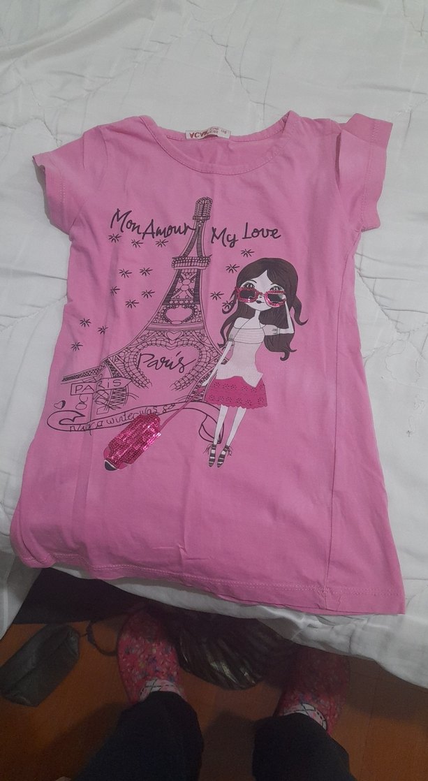Kısa kollu, yuvarlak yakalı, pembe tişört. Üzerinde "My Love, MonAmour" yazılı baskı ve sokak tarzı desen bulunur.