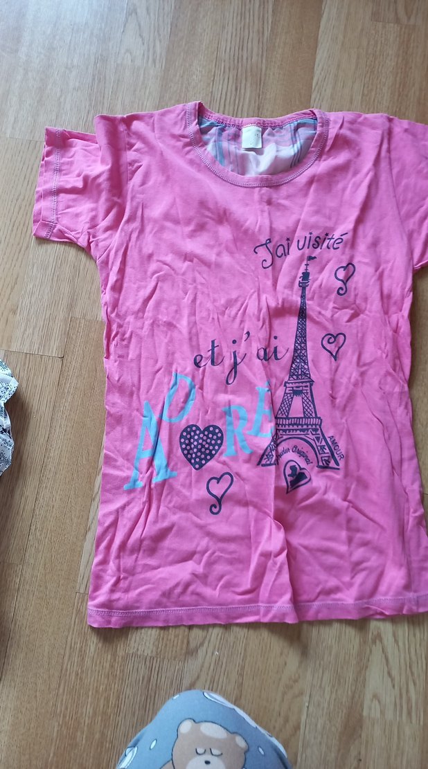 Pamuk kumaştan, kısa kollu ve bisiklet yaka kız çocuk tişörtü. Pastel pembe renkte, Eyfel Kulesi ve kalpli baskı deseni bulunur. Sokak stiline uygun.