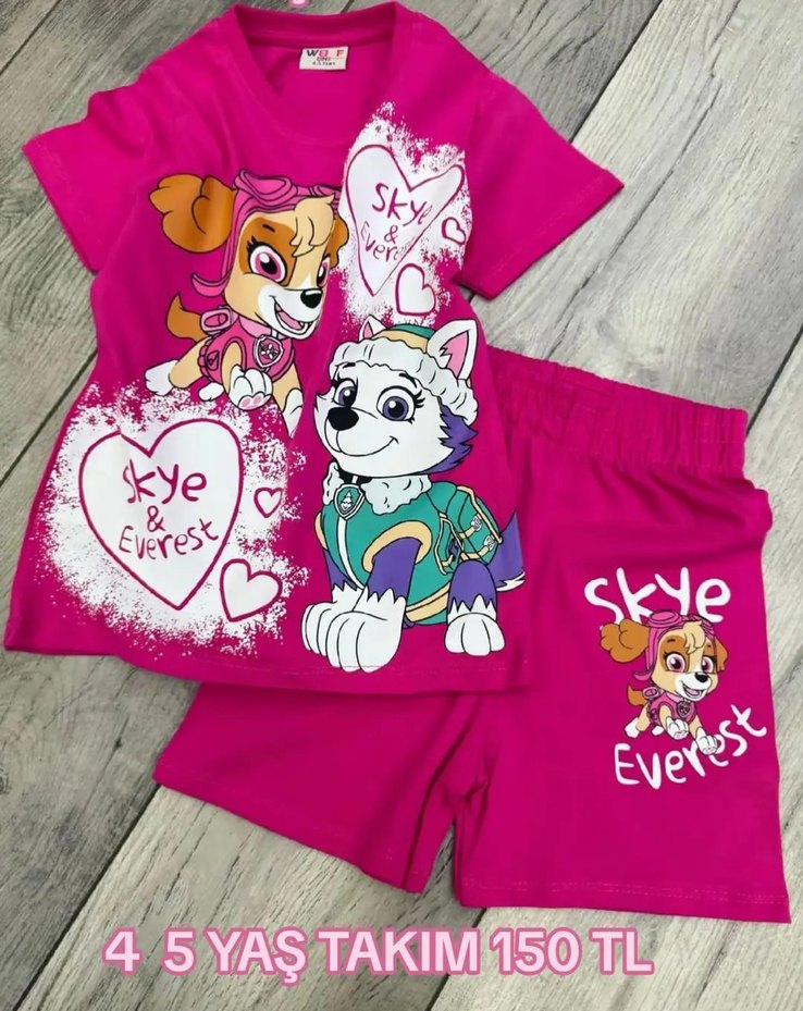 Renkli pembe kız çocuk takımı, dantel detaylı bol kesim kısa kollu tişört ve baskılı şorttan oluşur. Skye ve Everest karakterleri bulunur.