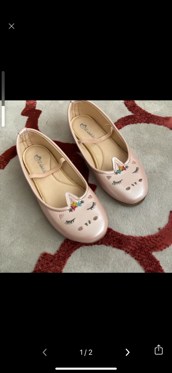 Kız çocukları için pembe baskılı unicorn desenli, tokalı bantlı, kauçuk tabanlı babetler.