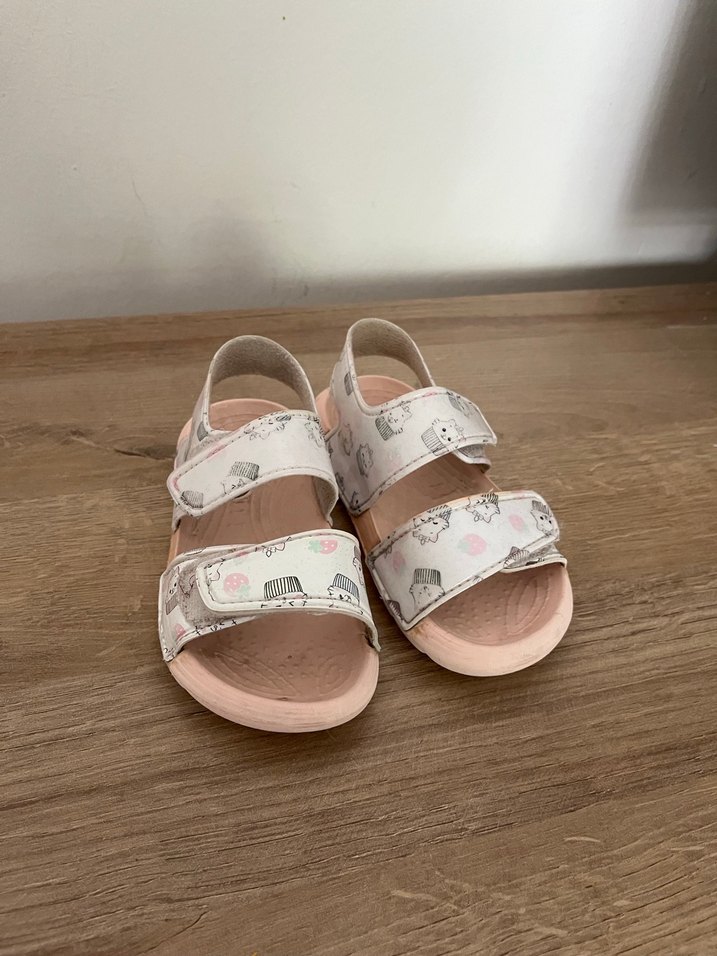 Pastel pembe renkli, baskılı desenli ve tokalı kayışlara sahip kız çocuk terliği, dayanıklı kauçuk malzemeden üretilmiştir.