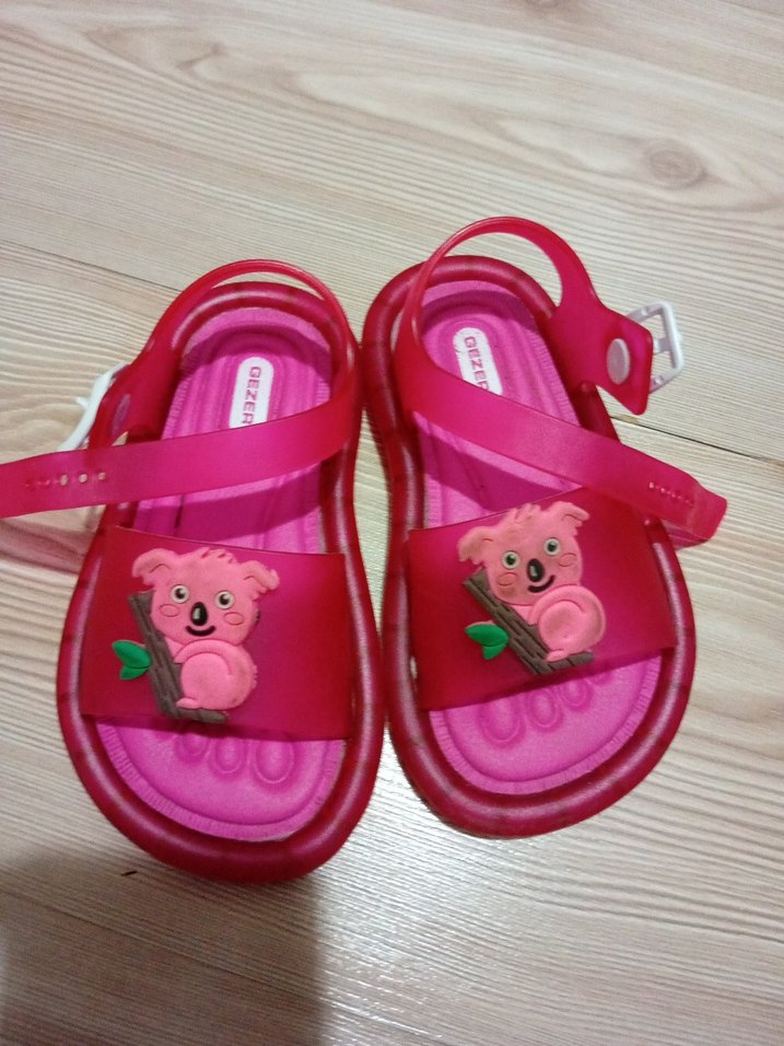 Pembe kauçuk kız çocuk terliği, renkli koala baskısı ve ayarlanabilir tokalı bantlarla, trend sokak stili için uygun.