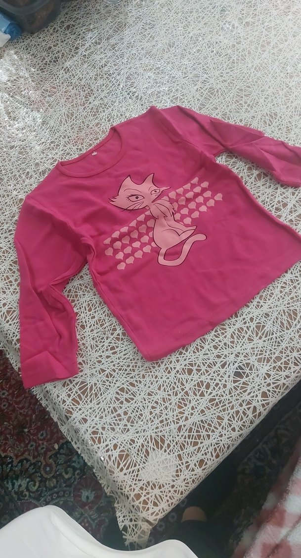 Pembe renkli, baskılı kedi ve kalp desenli, örgü yapılı, bol kesim, yumuşak ve sıcak kumaştan uzun kollu kız çocuk tişörtü.