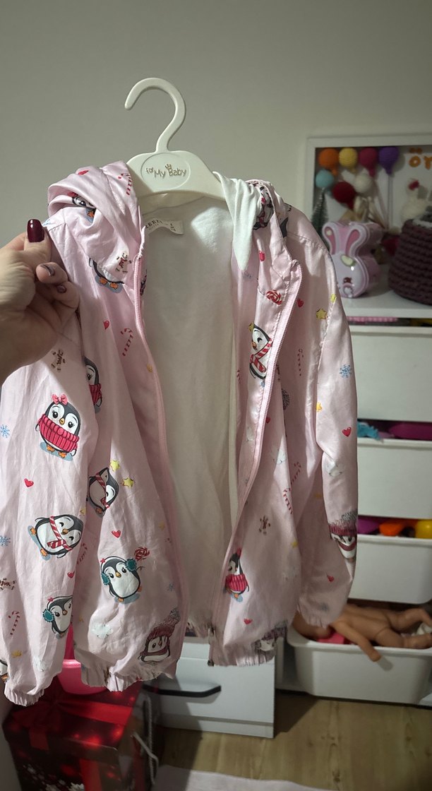 Kız çocukları için bol kesim, pembe baskılı yağmurluk. Sentetik kumaştan, düğmeli kapamalı ve çentikli yaka detaylıdır. Pastel renklerle günlük sokak stili için uygundur. ️kullanıldı ama temiz