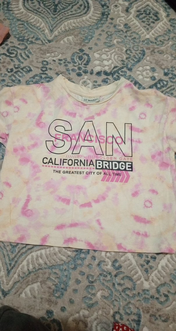 Kız çocukları için pastel pembe batik desenli kısa kollu, yuvarlak yakalı, bol kesim tişört. Sentetik kumaştan, California Bridge baskılı. Trend sokak stili için uygun.