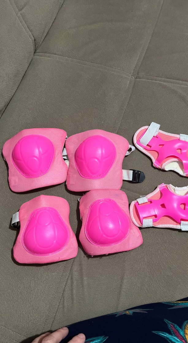 Pembe renkli, biker tarzı kız çocuk koruyucu setinde diz ve dirsek pedleri Velcro bantlarla sabitlenir. Renkli ve desensiz, trend belirleyiciler için uygun. ️