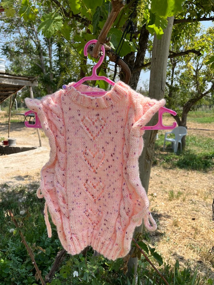 Pembe renkli, bohem tarzda kız çocuk pançosu, örme kumaştan ve kolsuz, boğazlı tasarıma sahip.