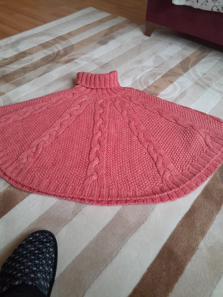 Pembe renkli, bohem tarzda, örgü kız çocuk pançosu. Boğazlı ve bol kesim, yumuşak dokulu.