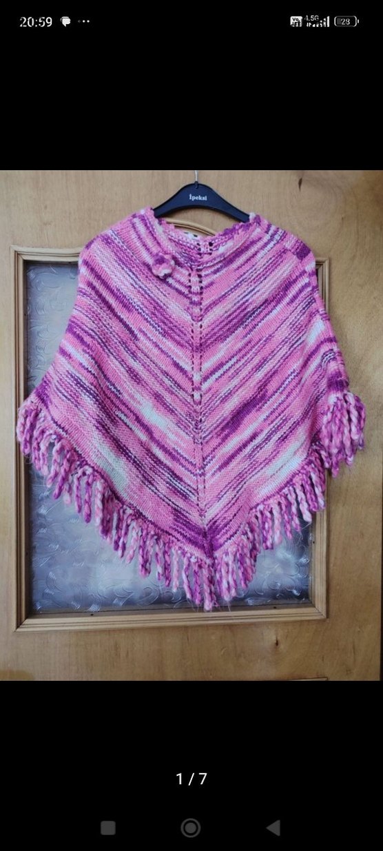 Kız çocuk için bol kesim, tekne yaka ve askılı kollu panço. Pembe tonlarında batik desenli, örgü ve püsküllü, bohem tarzda.