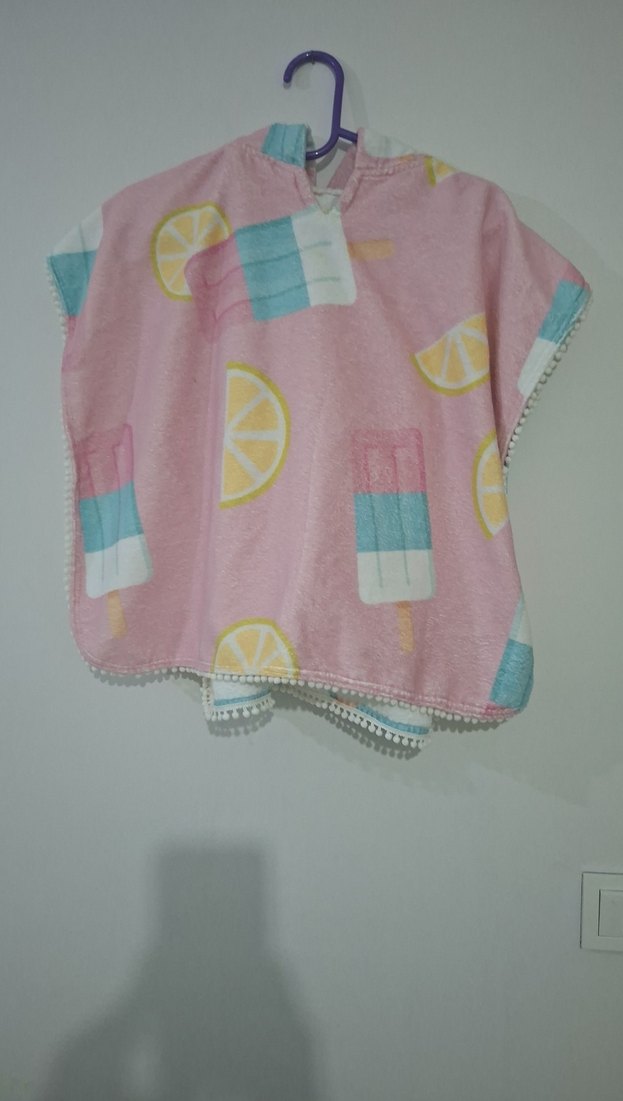 Kız çocukları için, yumuşak kumaştan yapılmış, dantel detaylı, pastel renkli tie-dye desenli, kolsuz, bol kesim ve bohem tarzda poncho.