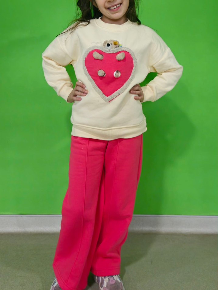 Yumuşak ve sıcak kumaştan yapılmış, bol kesim pembe kız çocuk eşofman altı. Rahat kullanım ve trend casual stil sunar. tam kisliktir. Ayıcığı sondaki resimdeki gibidir. sıfır üründür