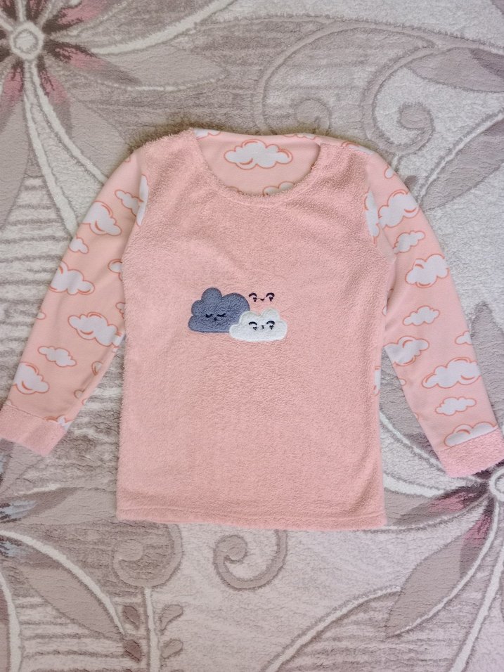 Pembe renkli, uzun kollu, yuvarlak yaka kız çocuk kazak. Yumuşak ve sıcak kumaştan, triko dokulu, bulut desenli. Rahat ve günlük tarzda. ☁️