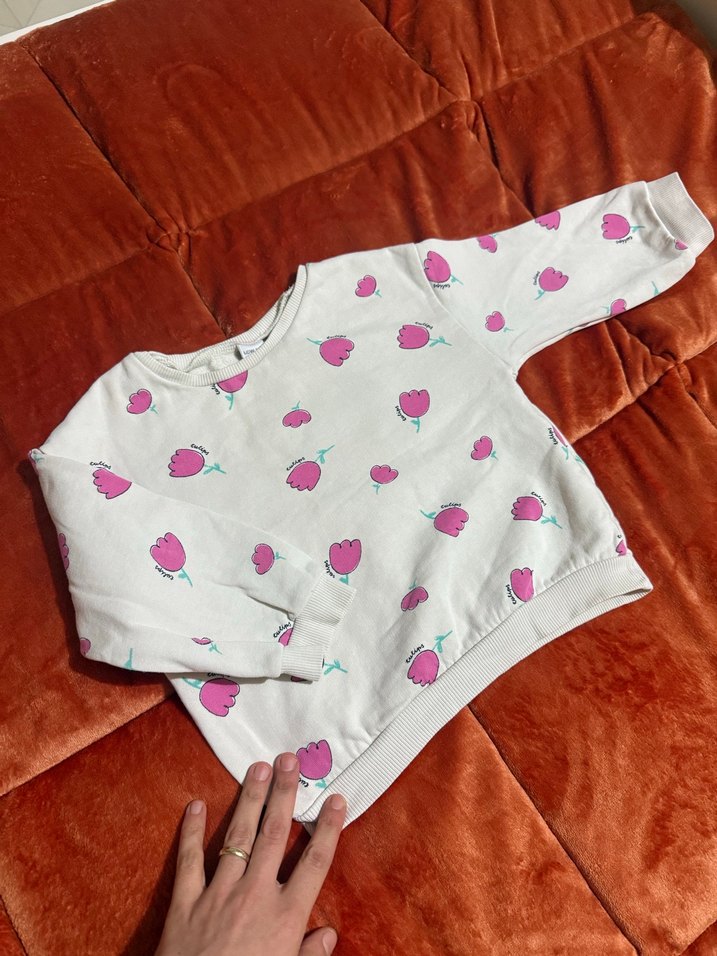 Yumuşak kumaştan, uzun kollu, bisiklet yaka ve bol kesim kız çocuk sweatshirtü. Pastel pembe çiçek baskısı ve düğme detaylarıyla rahat bir sokak stili sunar.