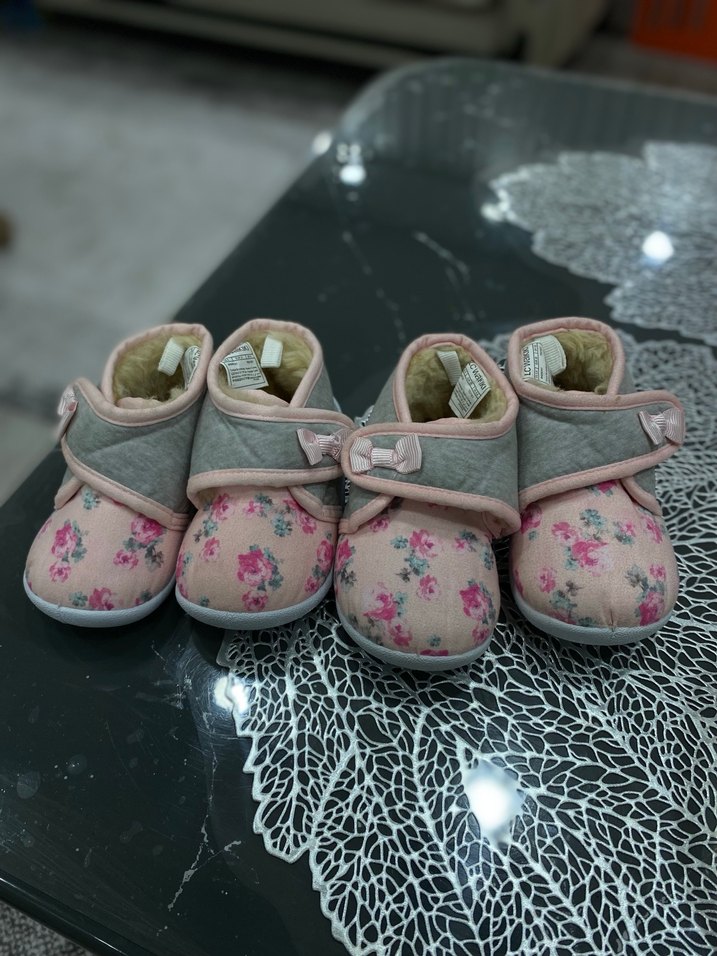 Pembe renkli, çiçek desenli ve gri cırt cırt bantlı, yumuşak astarlı ve kauçuk tabanlı sıcak kız çocuk terlikleri.