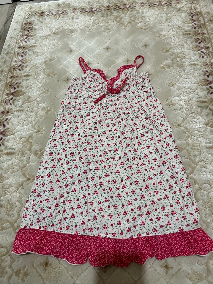 Pamuk kumaştan, çiçek desenli, askılı ve fırfırlı, bol kesim bohem tarzda kız çocuk elbisesi.