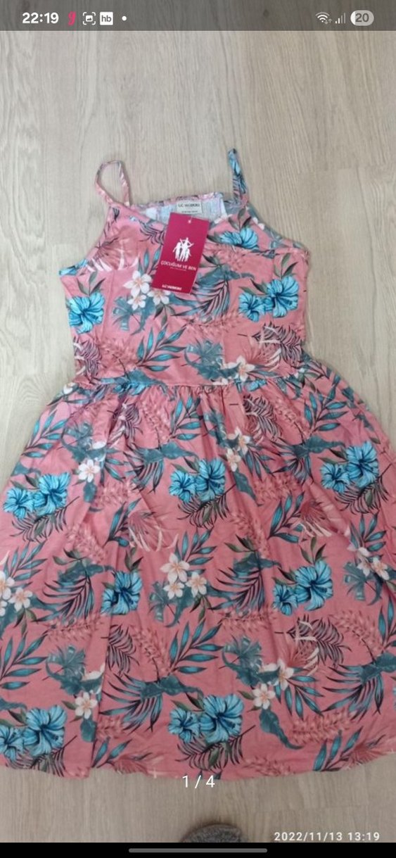 Pembe, pastel çiçekli baskılı, askısız, salaş kesim ve fırfırlı kız çocuk elbisesi. Yumuşak sentetik kumaştan, bohem tarzda.