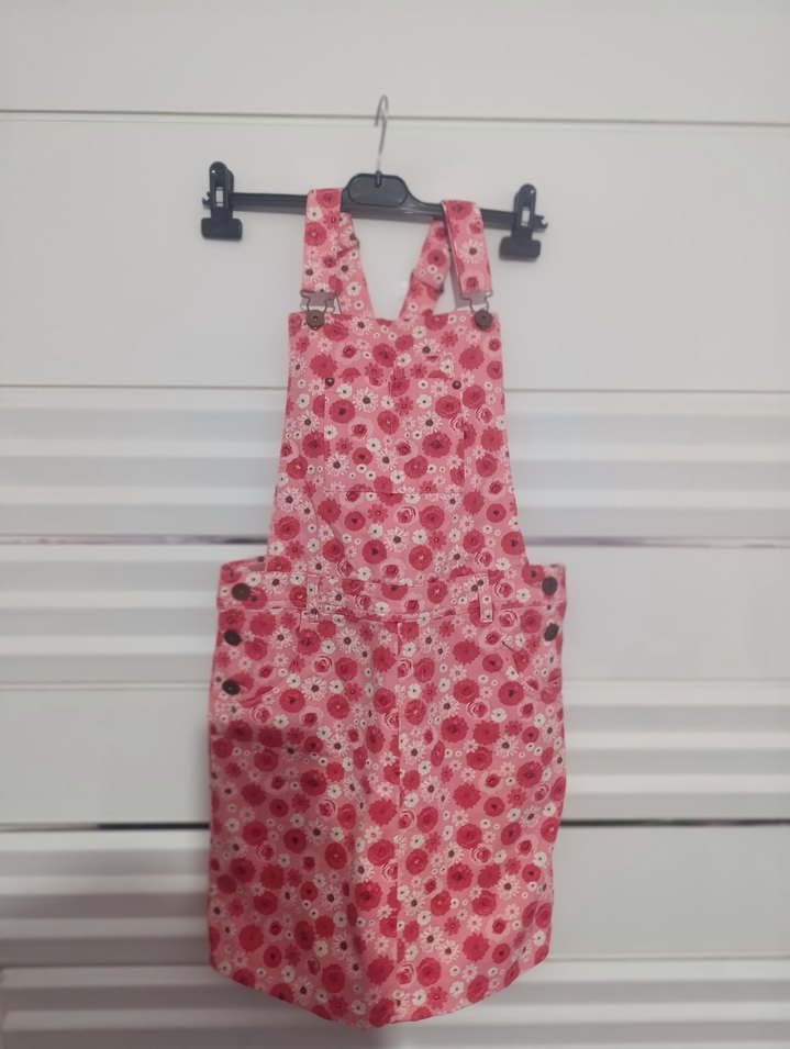 Kız çocukları için bol kesim, pembe renkli, çiçek desenli ve ayarlanabilir tokalı askılı sentetik kumaştan yapılmış bohem tarzda salopet.