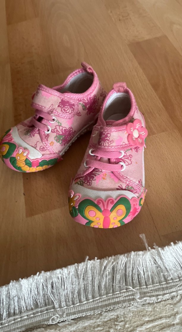 Pembe renkli, çiçek desenli kız çocuk spor ayakkabısı. Cırt cırtlı bantlı ve kelebek desenli kauçuk tabanlı, bohem ve retro tarzda.