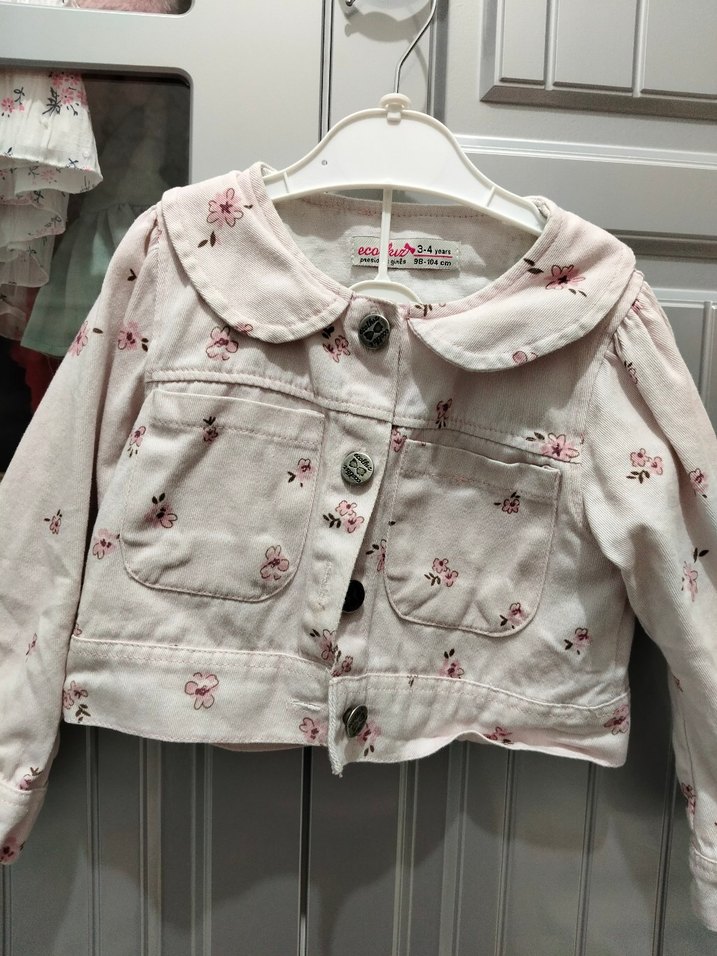 Pamuklu, düğmeli, yakalı ve çiçek desenli pembe, kız çocuklar için fit kesim ceket. Trend sokak stili için uygun.