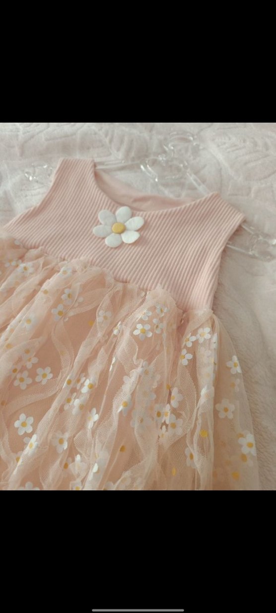 Kolsuz, straplez yakalı ve bol kesimli pembe elbise, çiçek desenli dantelle süslenmiş, papatya detayıyla bohem ve klasik şıklık sunar.