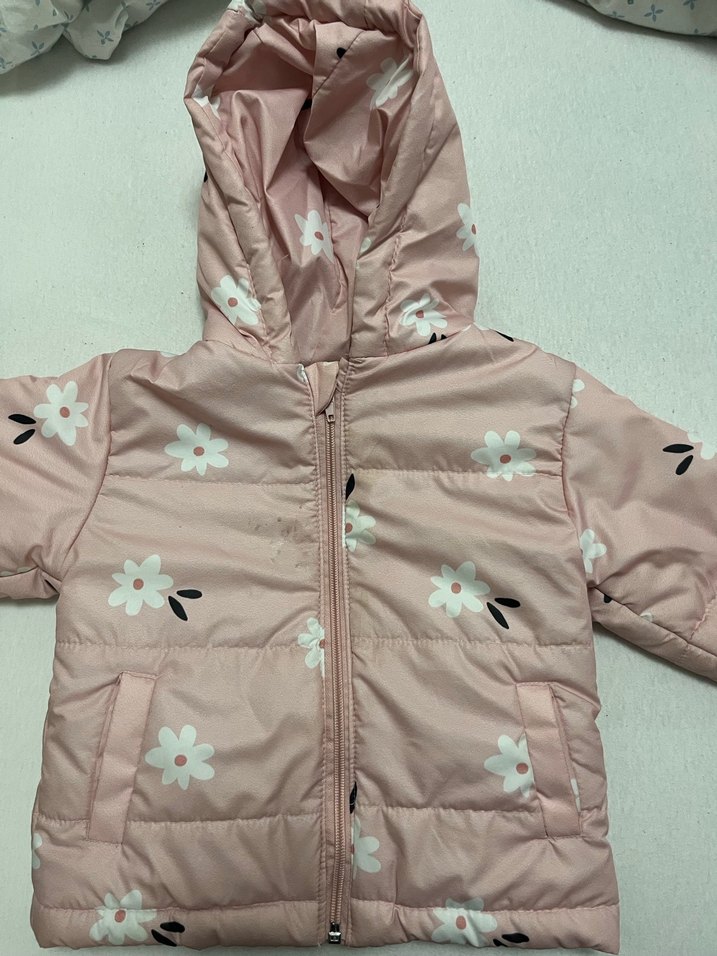 Yumuşak sentetik kumaştan yapılmış, fermuarlı ve çentikli yakalı, çiçek desenli pembe dar kesim mont. Mevsimlik ideal . 0 dan farksiz.