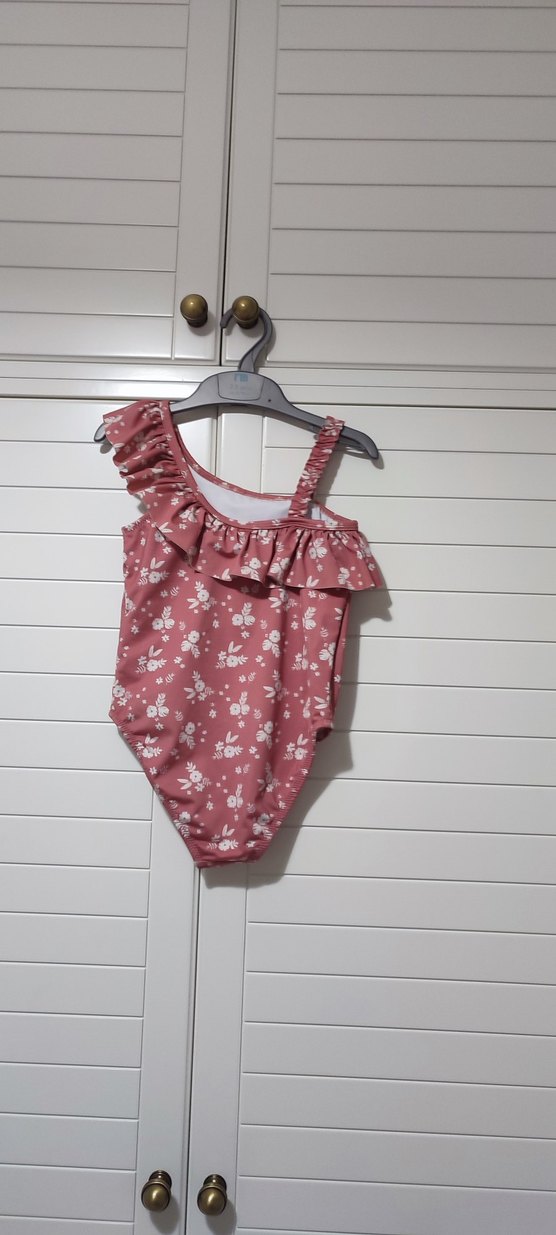 Pembe, çiçek desenli, tek omuz fırfırlı kız çocuk mayosu, plajda kullanıma uygun pastel tonlarda.