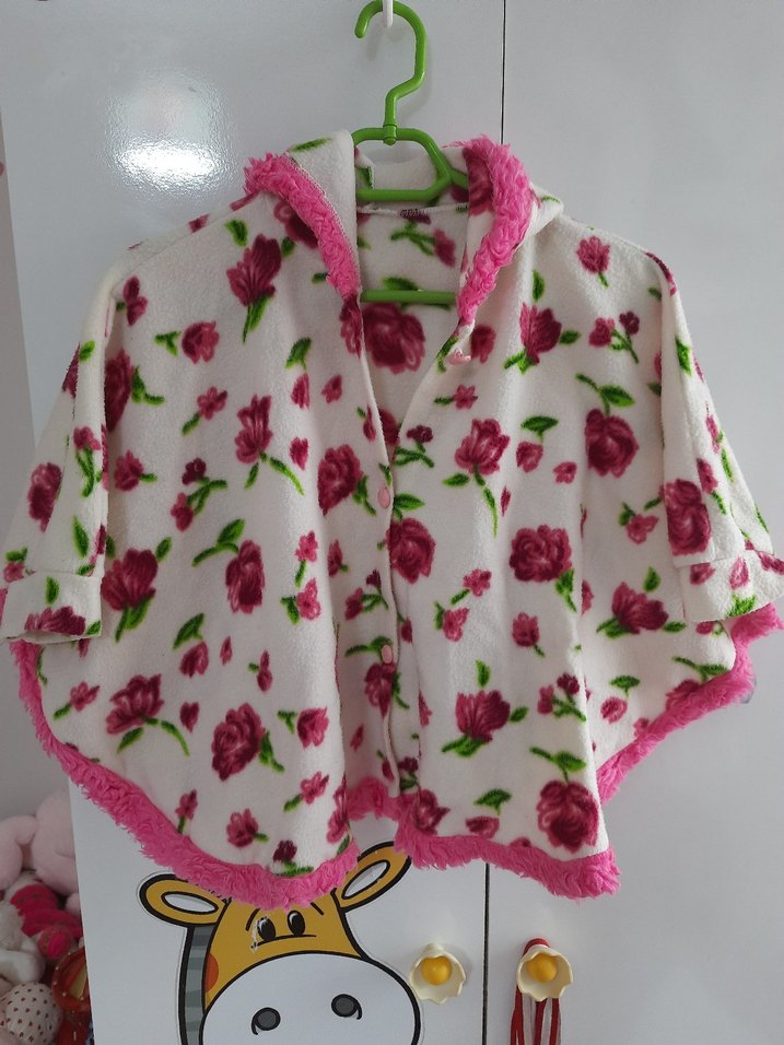 Kız çocukları için çiçek baskılı, fırfır detaylı, straplez ve kolsuz, yumuşak ve sıcak kumaştan üretilmiş bol kesim panço. 9 yaş diyor ama eğer üstüne tam otursun istiyorsanız, uzun olsun istiyorsanız 6-7 yaş için de uygun bence