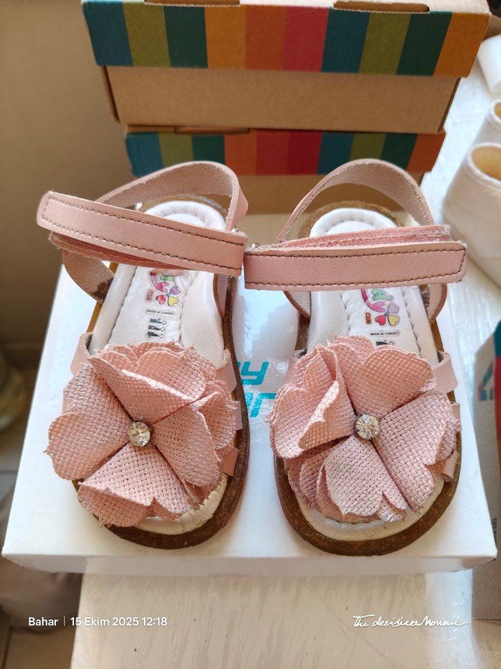 Kız çocukları için pembe renkli, çiçek desenli fırfırlı sandalet. Pastel tonlarda ve klasik, sade bir stile sahip, ayarlanabilir bantlı.19 no