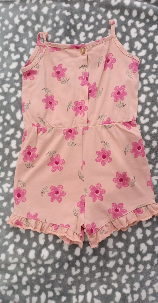 Pembe çiçek desenli, fırfırlı, kolsuz, bol kesim tulum. Yumuşak sentetik kumaştan, bohem tarzında.