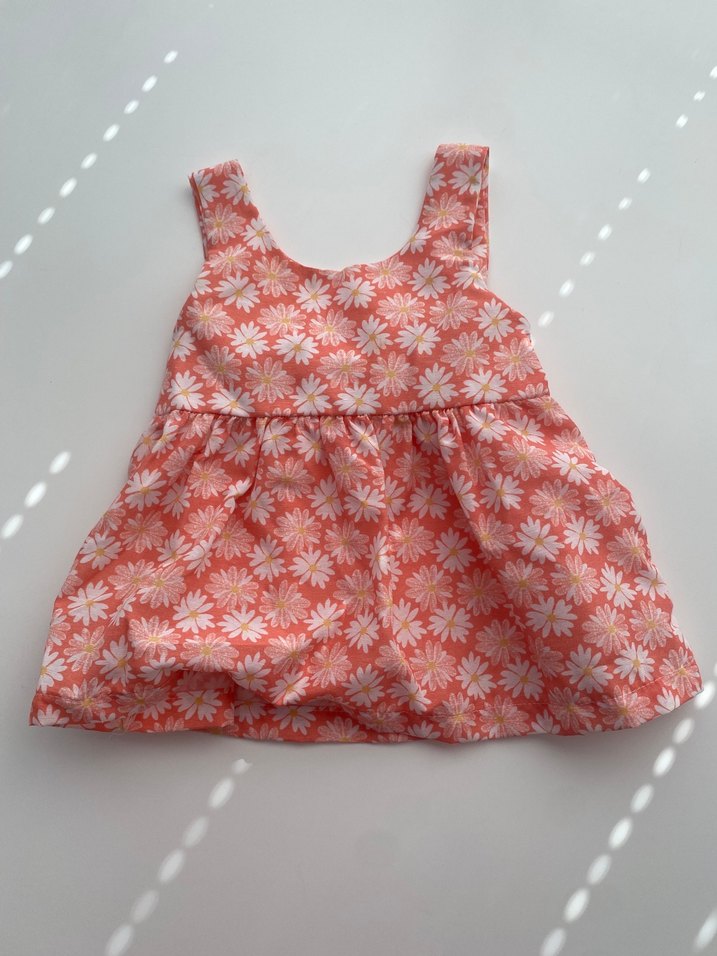Kolsuz, renkli çiçek desenli kız çocuk elbisesi, bol kesim ve fırfır detaylıdır. Sentetik kumaştan, straplez yakalıdır. 6 aylıktır