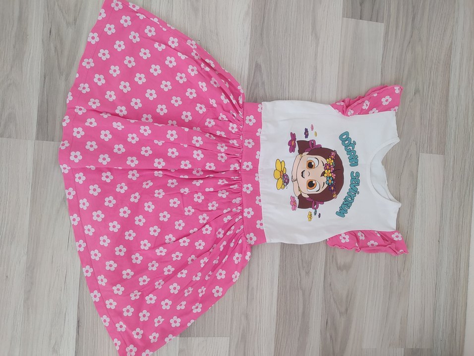 Pamuklu kumaştan yapılmış, kısa kollu ve bol kesim kız çocuk elbisesi. Pembe renkte, çiçekli desenli ve fırfırlı, bohem tarzda rahat bir modeldir. 2 defa giyildi sadece hiç bir sorunu yok