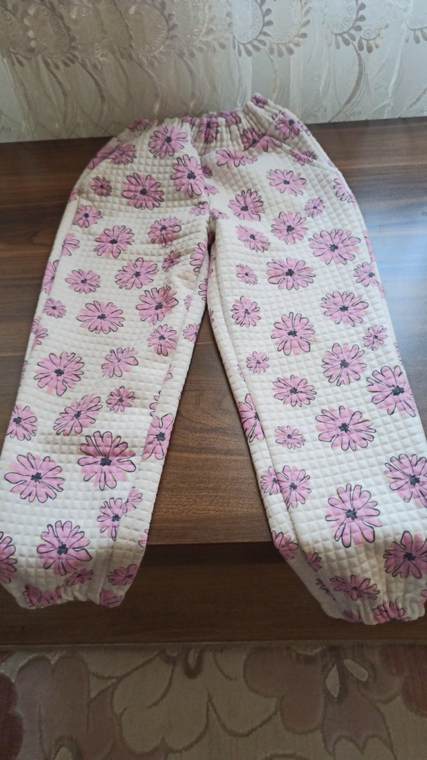 Yumuşak ve sıcak kumaştan yapılmış, pastel pembe çiçek desenli kız çocuk rahat kesim eşofman altı. Rahat bir görünüm için ideal.