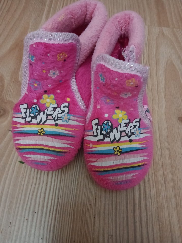 Kız çocukları için örgü, çiçek desenli, pembe renkli, yumuşak ve sıcak kumaştan üretilmiş ev terliği. Bohem ve retro tarzına uygun.