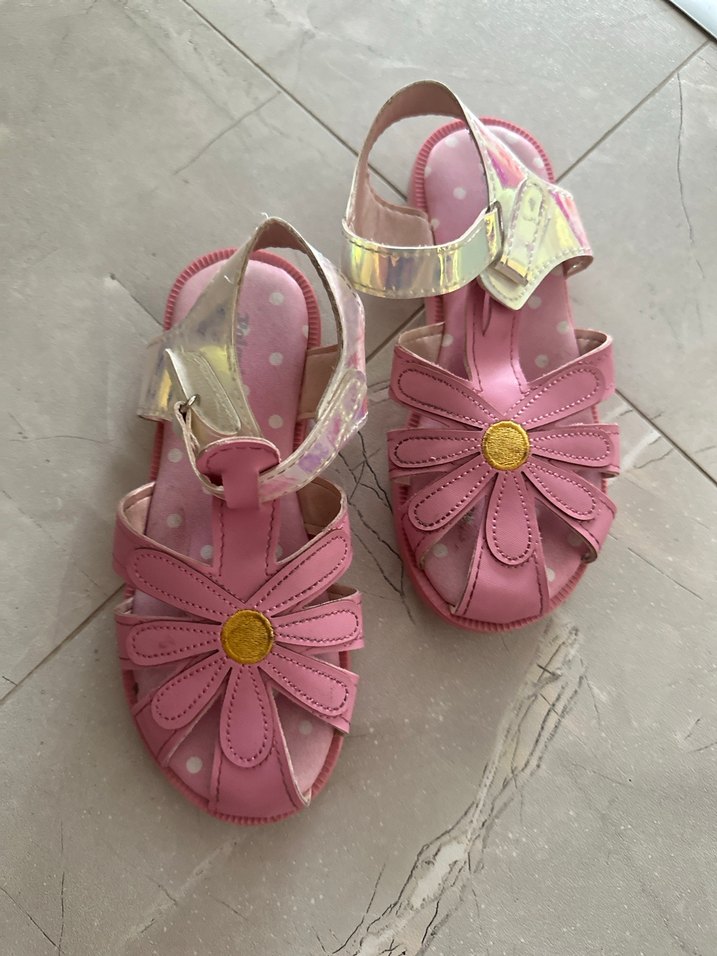 Pembe renkli, tokalı bantlı ve çiçek desenli kız çocuk terliği, bohem ve retro tarzda.