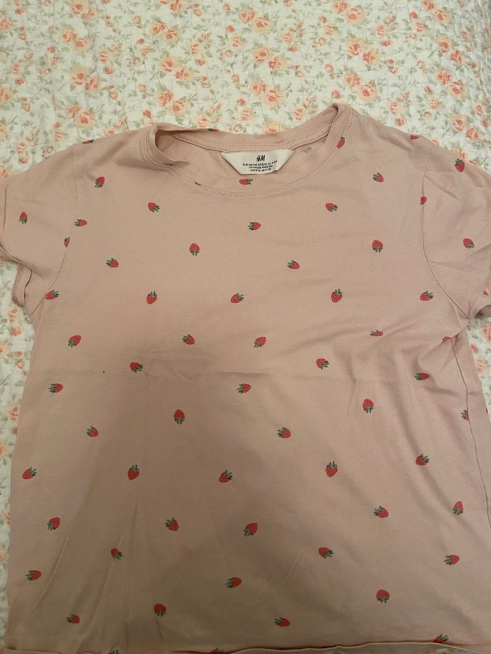 Kız çocukları için pamuklu, kısa kollu, yuvarlak yaka ve çilek baskılı pembe tişört. Omuzda düğme detayı bulunur.