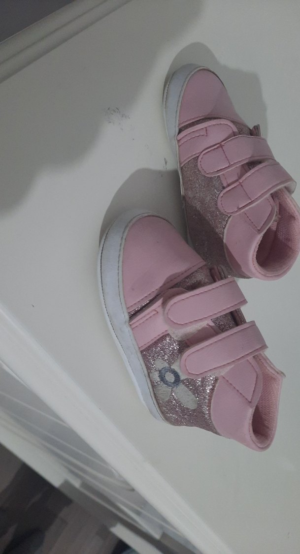 Pembe renkli, cırt cırtlı kız çocuk spor ayakkabısı. Pastel tonlarda, kauçuk tabanlı ve sokak tarzına uygun.Sayili giyildi silinip giyilecek 19 numaradır