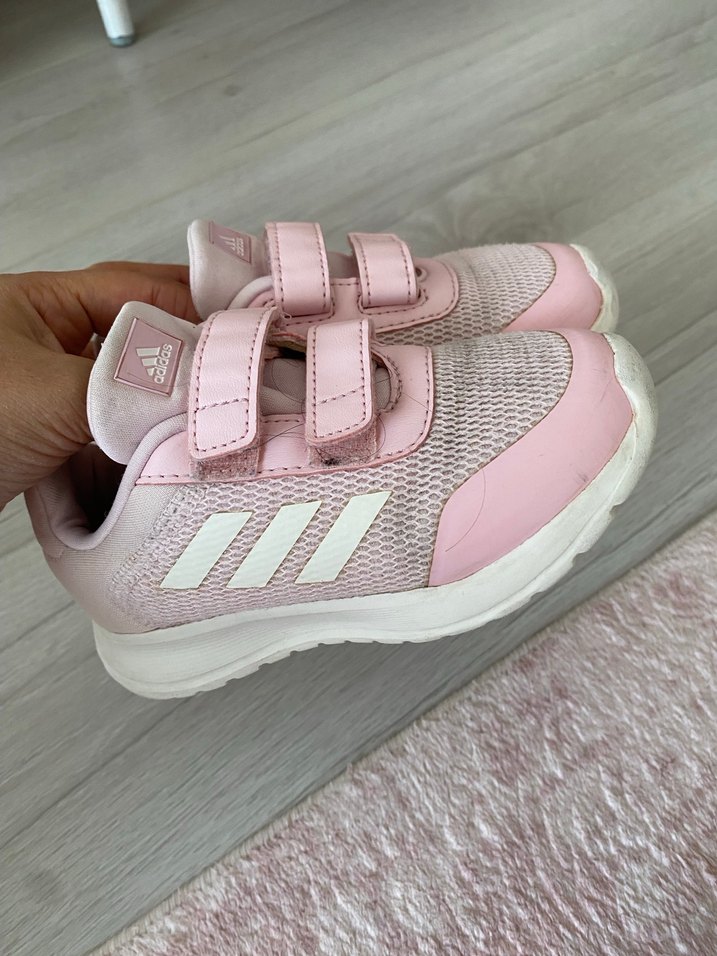 Pembe tonlarda, baskılı desenli kız çocuk spor ayakkabısı. Kolay kapanan cırt cırt bantlı ve kauçuk tabanlıdır.
