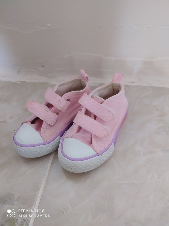 Pastel pembe renkte, bağcıksız cırt cırtlı bağlama ve kauçuk tabana sahip kız çocuk spor ayakkabısı.