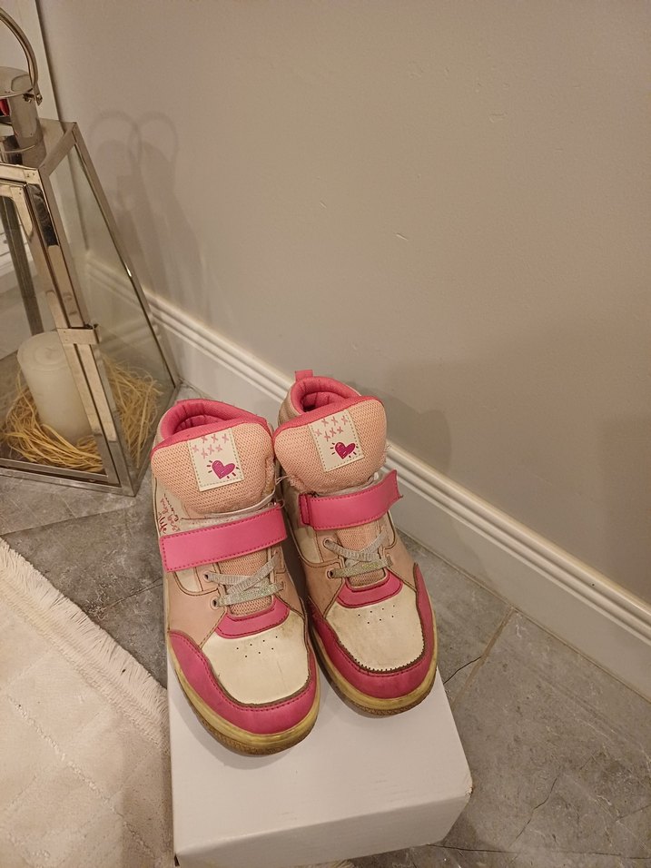 Pastel pembe renkli, kauçuk tabanlı ve cırt cırtlı kız çocuk spor ayakkabısı, trend sokak stili için uygundur. Desensiz ve kullanımı kolaydır.