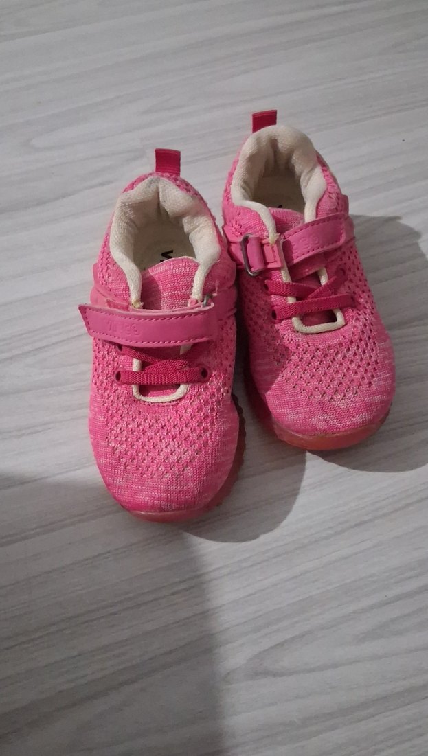 Kız çocukları için canlı pembe renkte, yumuşak ve nefes alabilen kumaştan, kauçuk tabanlı spor ayakkabılar. Kolay kapanan cırt cırtlı bantlıdır.