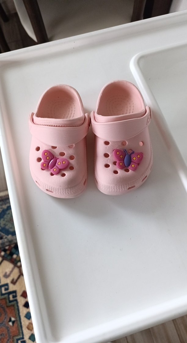 Kız çocukları için pembe kauçuk terlikler, cırt cırtlı bant ve nakışlı kelebek detaylarına sahiptir. Renkli ve sade tarzı, rahat havalandırma delikleriyle tamamlanmıştır.