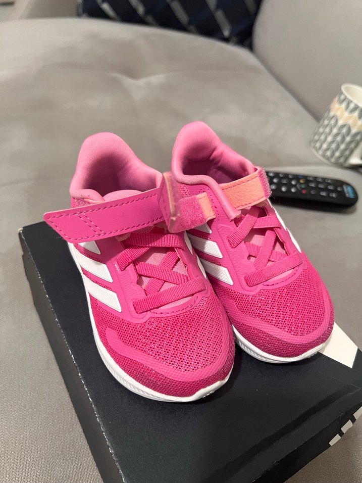 Canlı pembe renkte, baskılı ve cırtcırtlı kız çocuk spor ayakkabısı. Kauçuk tabanlı, sokak stilinde rahat tasarım. Kızım yürümeden önce almıştım üç dört kere ancak giyindi şu an ayağına olmuyor. Kutusu faturası mevcuttur. Trendyoldan aldım. 24 Nisanda aldım.